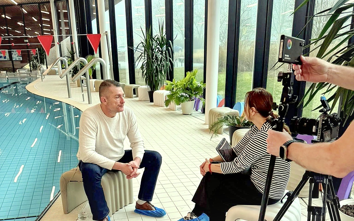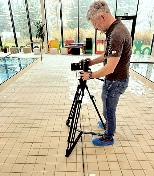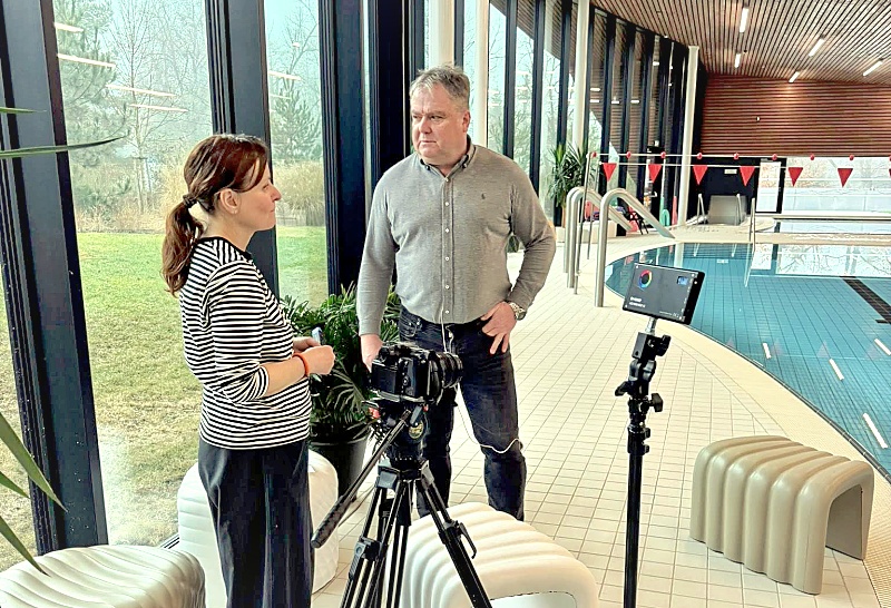 (na snímcích: pondělní natáčení v prostorách plavecké haly v Lounech, na prvním snímku v bílém svetru pro pořad Příběhy staveb hovoří starosta města Milan Rychtařík. Úplně dole je pohled na moderní stavbu při vstupu zvenčí. Foto Lounská správa plaveckých areálů)