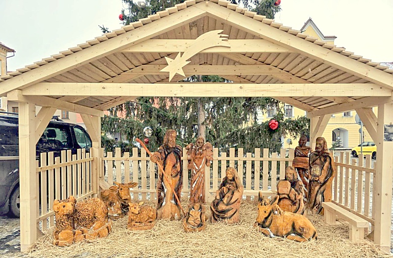 (na snímcích: nové betlémy, které si letos pořídily do svého majetku radnice v Lounech a Žatci k pravidelné vánoční výzdobě. Oba už jsou umístěné u ozdobených stromů na náměstích, nahoře je nový betlém v Lounech a dole v Žatci. Foto město Louny a město Žatec)