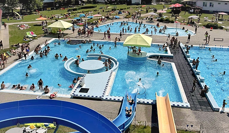 (na snímcích: koupaliště v Lounech těsně před zahájením sezony a dole s vysokou návštěvností při parných letních dnech. Foto Lounská správa plaveckých areálů)