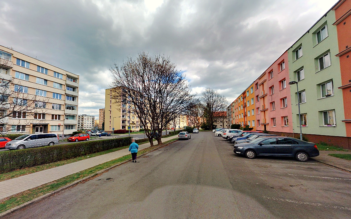 (na snímku nahoře: ulice Jana Švermy mezi paneláky v Lounech. Jeden z chodníků je v levé části záběru. Město teď připravuje opravu. Foto Mapy.cz)