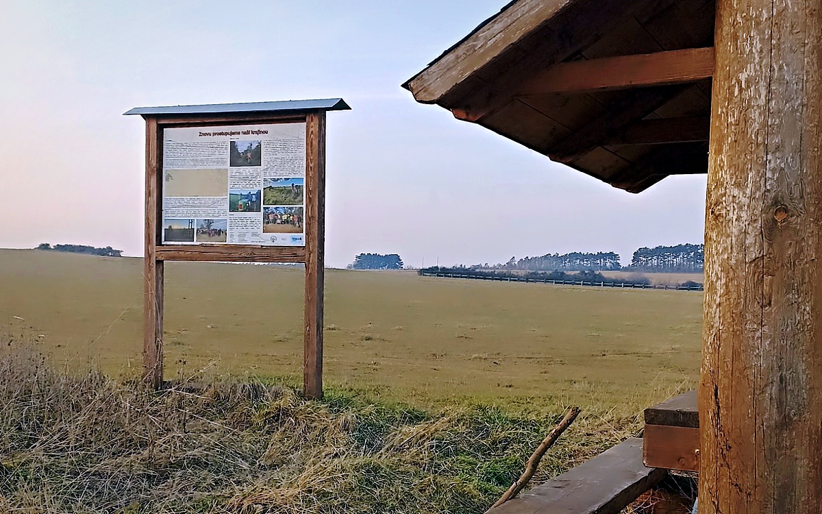 Cestu lemuje osmdesát mladých hrušní. K přístřešku pro výletníky teď přibyla i nová informační tabule
