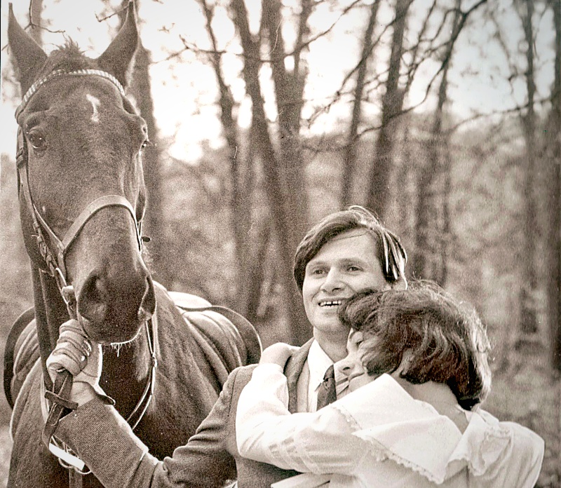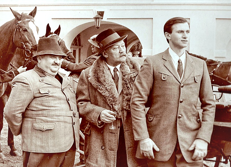 (na snímcích: Jan Hrušínský a členové štábu v Krásném Dvoře, níže je také při scéně s bratrem Rudolfem a s manželkou Miluší u Činoherního studia v Ústí nad Labem, kde se seznámili při herecké práci. Úplně dole jsou snímky z filmu Konec starých časů, který se natáčel v roce 1988 na zámku v Krásném Dvoře pod taktovkou Jiřího Menzela. Foto Jan Hrušínský a Miroslav Mirvald)