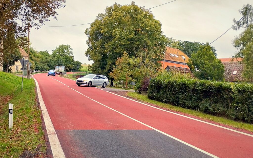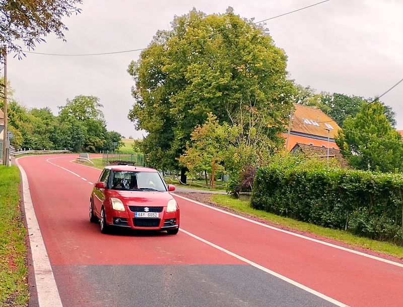 Nový povrch silnice ve Pšově: červená barva upozorňuje na rizikový úsek, pomáhá i proti případnému smyku