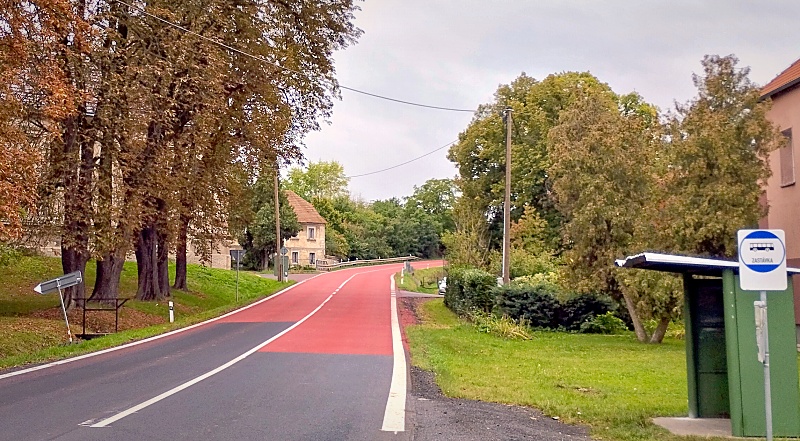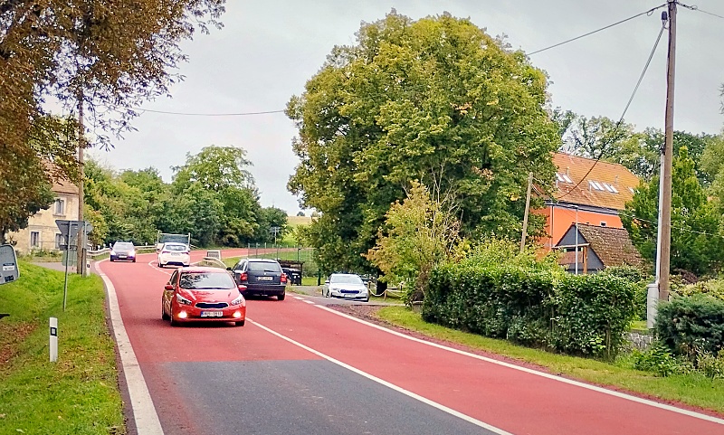 (na snímcích: nový červený povrch vozovky ve Pšově při pohledu ze směru od Žatce. Na prvním obrázku vyjíždí auto vpravo z areálu výchovného ústavu. Úplně dole je naopak pohled ze směru od Podbořan, za vozovkou je pšovský kostel. Foto Libor Želinský)