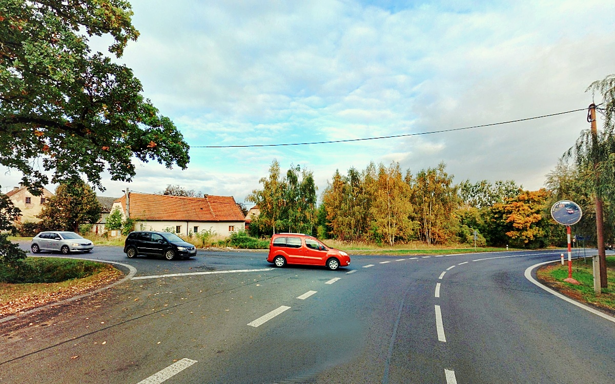 (na snímku nahoře: auta přijíždějící od Podbořan dávají přednost, řadí se „do fronty“ a opatrně vjíždějí na hlavní silnici Plzeň–Žatec. Výhled do složité křižovatky se zatáčkou jim usnadňovalo dopravní zrcadlo /vpravo/, ale to nyní na místě není a je potřeba dávat opravdu velký pozor. Foto Mapy.com)