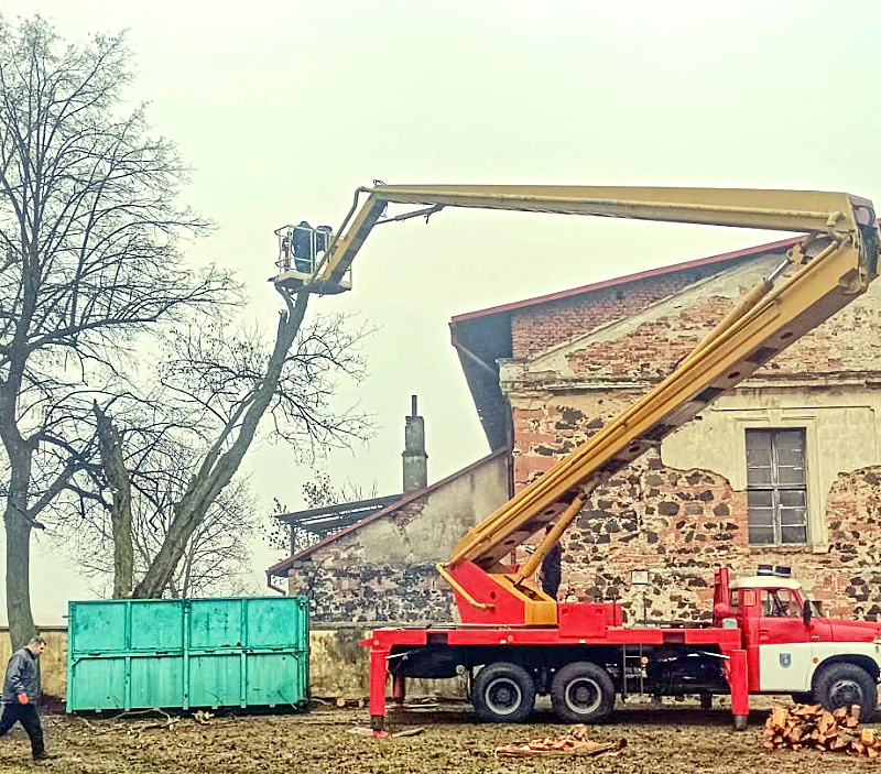 (na snímcích: kácení tří starých akátů v zahradě u zámku v Krásném Dvoře. Foto Státní zámek Krásný Dvůr a SDH Krásný Dvůr)