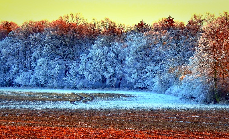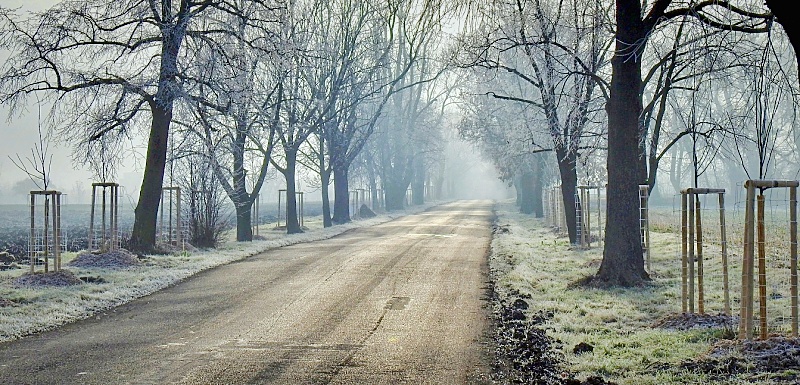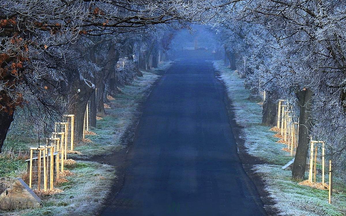 (na snímcích: stromky vysázené podél silnice Krásný Dvůr – Buškovice. A dole je poetická atmosféra současné zimy v zámeckém parku. Foto Ludovít Jančík)