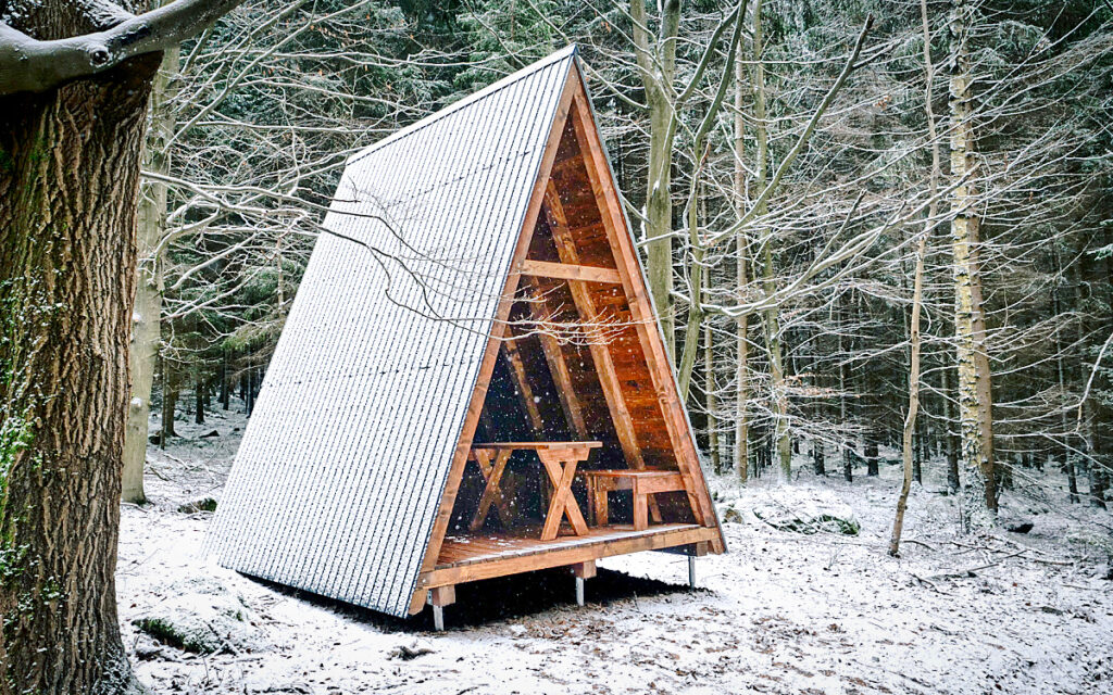 (na snímcích: nové přístřešky v lesích v severních Čechách v zimním a podzimním počasí. Spodní snímek je útulna u Klínovce. Při chladu, sněhu či dešti se dá zavřít přední čelní „přepážka“. Foto Lesy ČR)