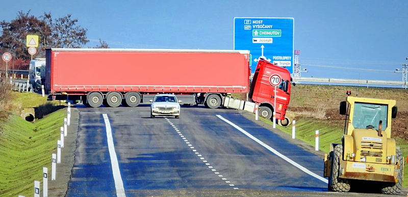 Drobnější havárie červeného kamionu se odehrála ve středu (10.12.), celý nový obchvat Žiželic i s novým mohutným silničním mostem se pro řidiče otevře již nyní v pondělí (15.12.). Celá stavba v terénu i s vrty a dalšími přípravami trvala více než tři roky, dlouhé objížďky pro nejtěžší vozy nákladní dopravy (se zajížďkou až kolem 80 km, pozn. red.) musí jejich šoféři dodržovat už rok a půl, trasa přes Žiželice je zavřená od května 2024. Čas od času se stává, že to některý z řidičů stejně „zkusí“ a buď omylem, nebo možná i s určitou „nadějí“ vjede do uzavřeného prostoru stavby, ale pak má nemalé problémy – středeční kolize červeného kamionu nebyla nějakou zvláštní či ojedinělou výjimkou.