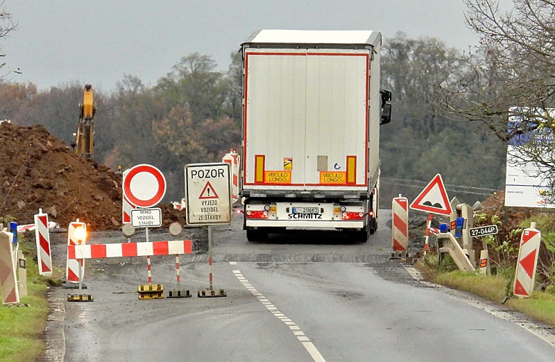 Žiželice – Dlouhý červený kamion i s návěsem mířil do prostor stavby v okolí Žiželic, i když jsou příjezdové směry ze všech stran stále uzavřeny a hotový obchvat se otevře pro všechny řidiče až za pár dní. Potom si jeho řidič zřejmě svou chybu uvědomil, snažil se couvat a ve vhodném místě dlouhou soupravu otočit. Jenže manévr se mu nepovedl a předek tahače zůstal zaklíněný v příkopu a v hlíně, kola se točila „naprázdno“. K zásahu pak musela přijet těžká technika, která potom kamion po několika hodinách pomohla vyprostit a přesunout zpět na zpevněnou komunikaci.