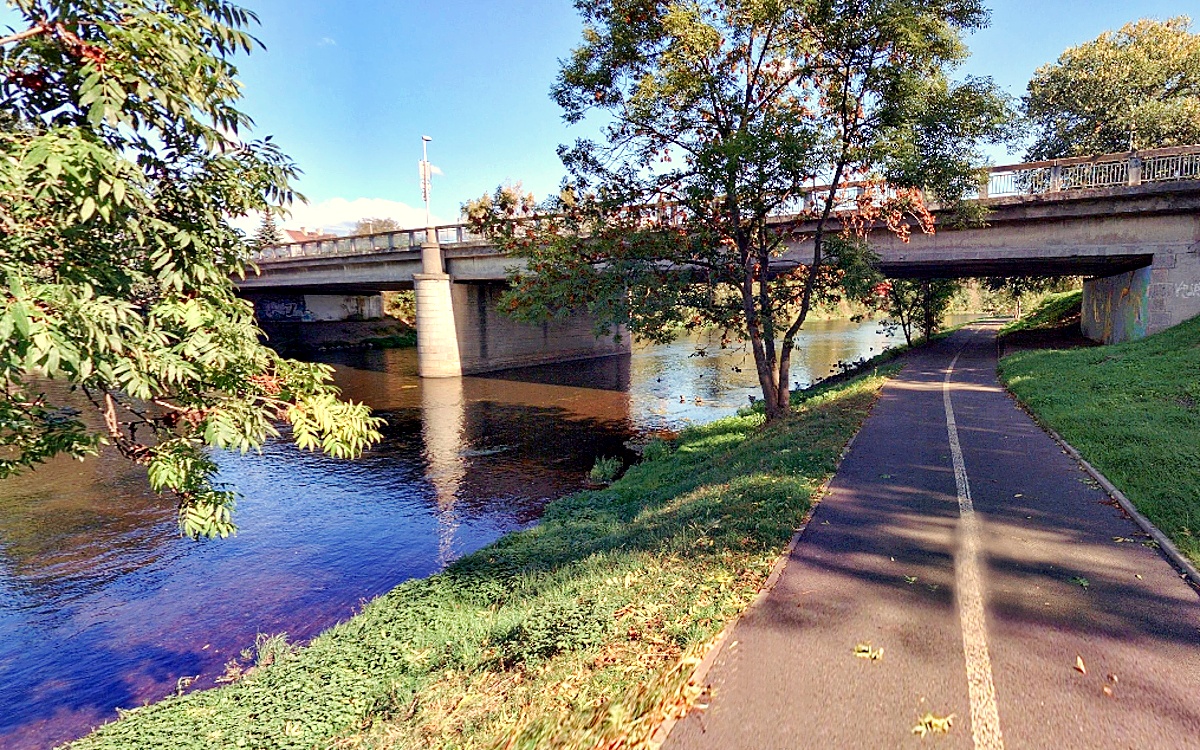 (na snímku nahoře: cyklostezka na pravém břehu Ohře v Žatci. Určitou zajímavostí je, že vede i pod tělesem silničního mostu s hlavním tahem Plzeň–Žatec–Most. I v těchto místech budou od letošního podzimu svítit nové lampy. Foto Mapy.cz