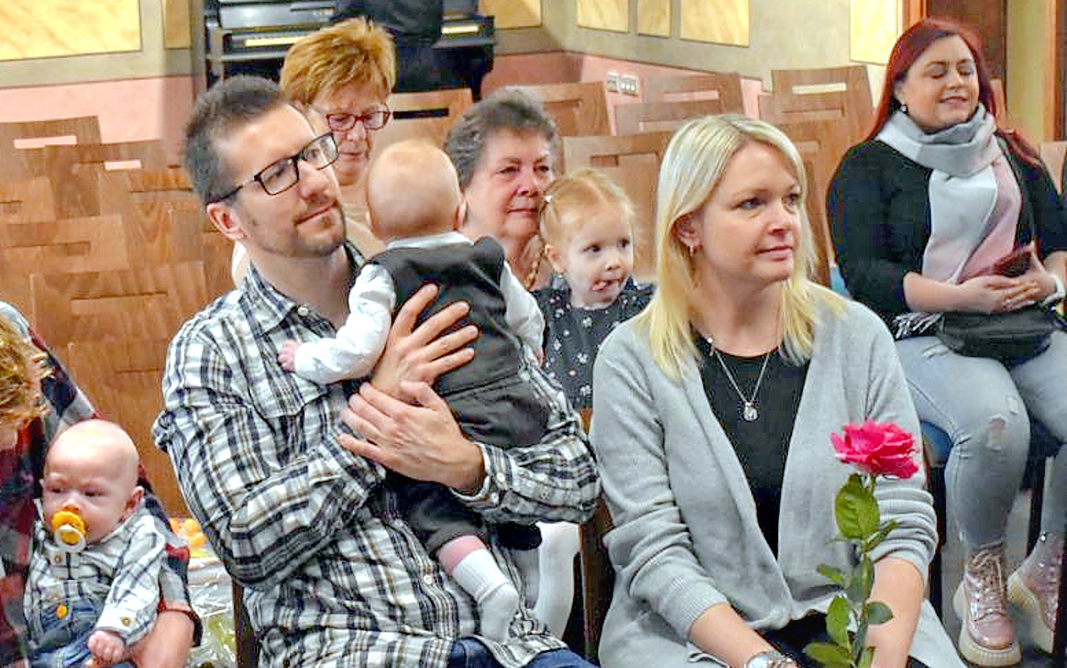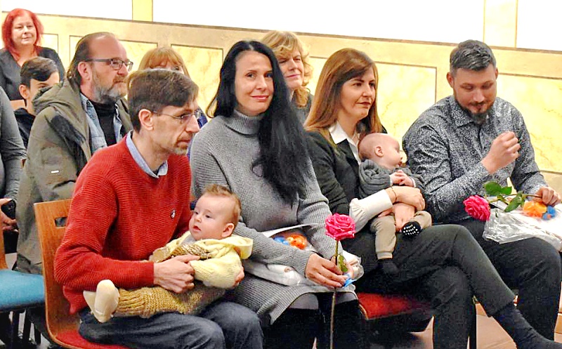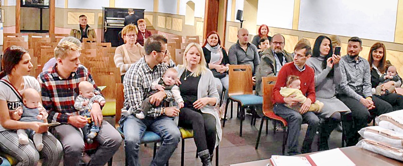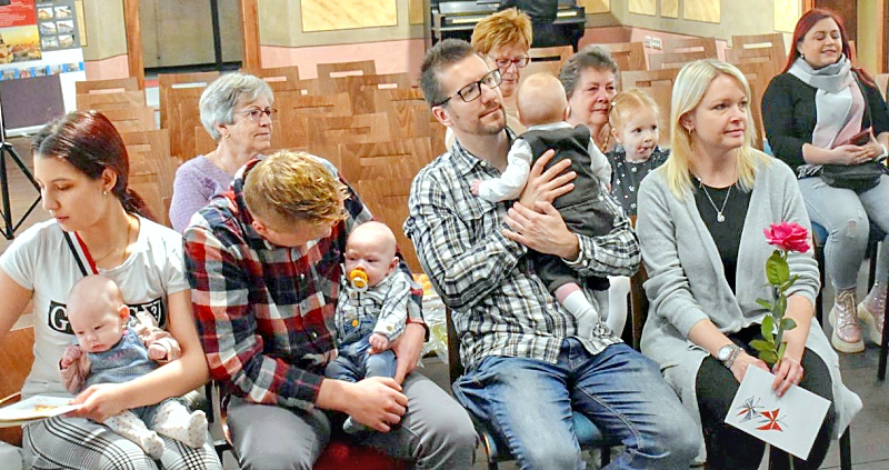 (na snímcích: Rodiny na tradičním obřadu vítání občánků v Žatci, který v únoru poprvé proběhl v nově opravených prostorách Kapucínského kláštera. Foto Tomáš Kassal)