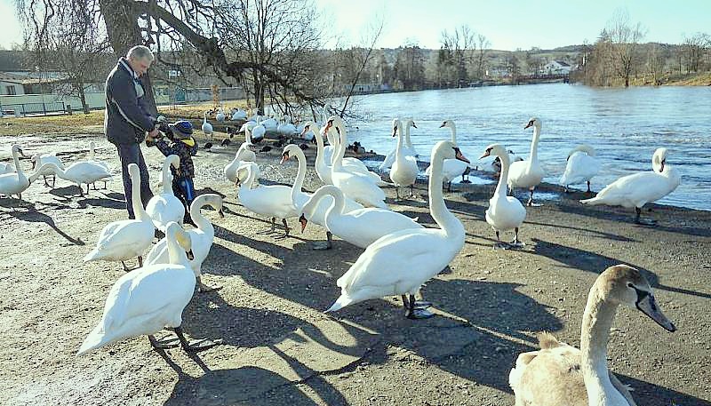 (na snímcích: nové směrovky, které jsou od ledna na „umělém stromě“ v oblasti zimoviště vodních ptáků pod Chaloupkou v Žatci. Dole je krmení kachen a labutí – oblíbená a příjemná zábava pro mnoho různých generací v Žatci. Foto Technická správa Žatec, Domov seniorů Žatec a Libor Želinský)