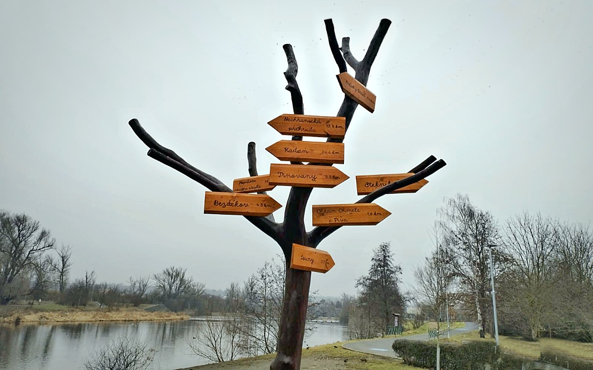 Žatec – Nová zajímavost se v průběhu ledna objevila na „umělém stromě“, který zkrášluje prostor na nábřeží u restaurace Chaloupky v Žatci, kde je odpočinková cesta pro lidi na procházkách i cyklostezka a také roky známé zimoviště vodního ptactva u Ohře. Strom měl delší dobu jen holé „větve“, teď na nich ovšem přibylo zhruba deset dřevěných tabulek se směrovkami, kam se mohou návštěvníci a turisté z místa u řeky také vydat.