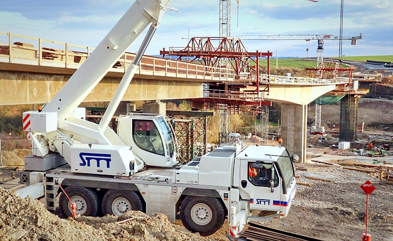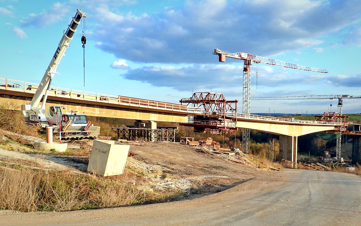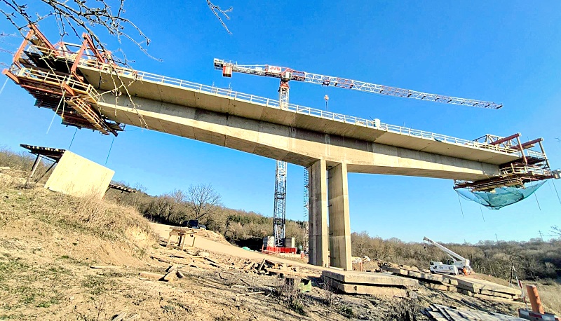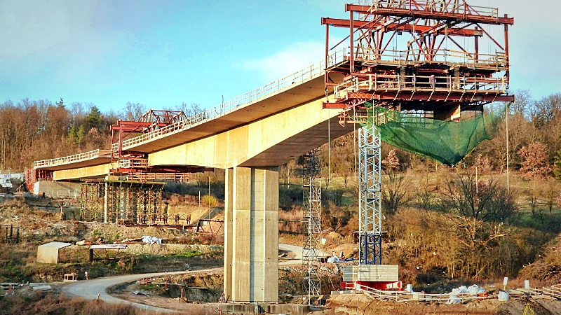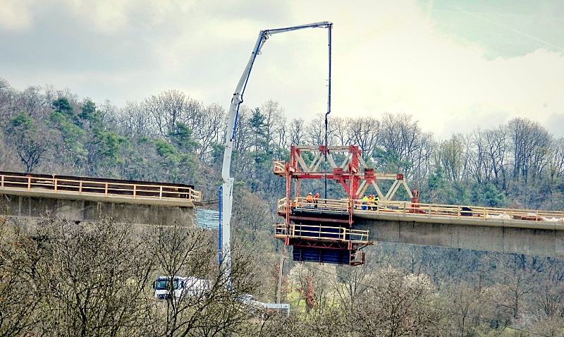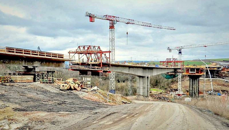 (na snímcích: nový vyrůstající dlouhý most přes údolí s říčkou Hutnou a obcí Žiželice. Jednotlivé „díly“ se už k sobě hodně přiblížily, ke spojení chybí jen malý „kousek“. Foto Petr Marek)
