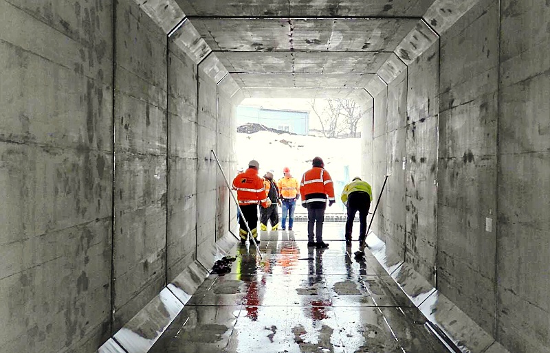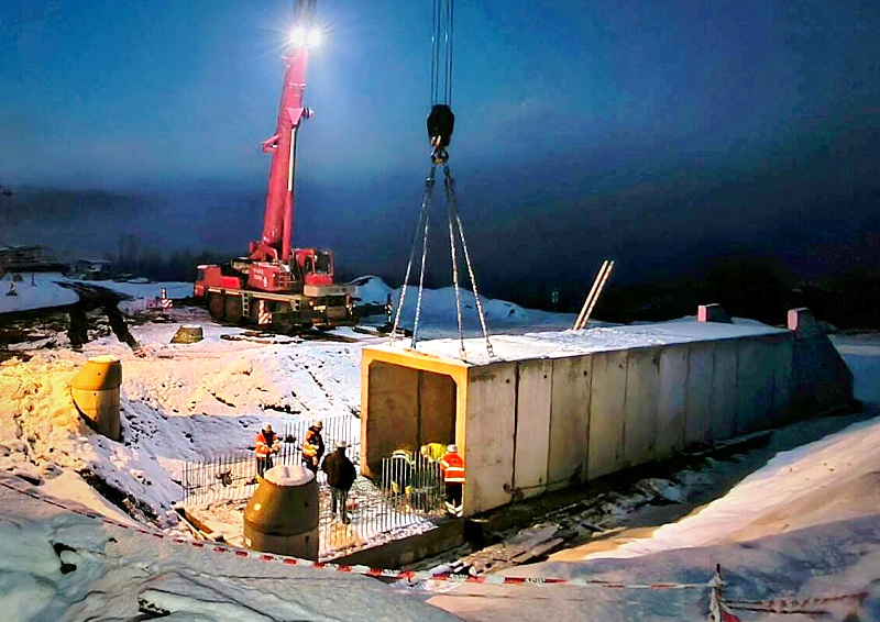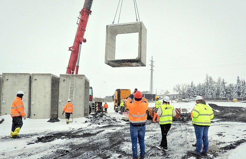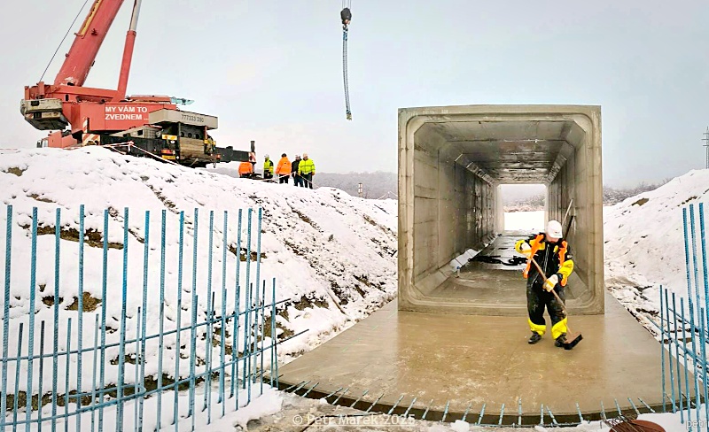 Podchod bude dlouhý několik desítek metrů. Po vyhloubení jámy se nyní montuje dohromady z obřích několikatunových betonových prefabrikovaných dílů. Prvních pár dílů na místo zamířilo již ke konci listopadu a tento týden pracovníci stavebních firem přivezli a upevnili další. Náklaďáky přivezly přibližně deset „prefabrikátů“, na korbu se vešel vždy jen jeden. Jeřáby je potom pomohly vyložit a následně i namontovat na určené místo. Hlavní montáž podchodu probíhala nyní ve čtvrtek (13.2.).