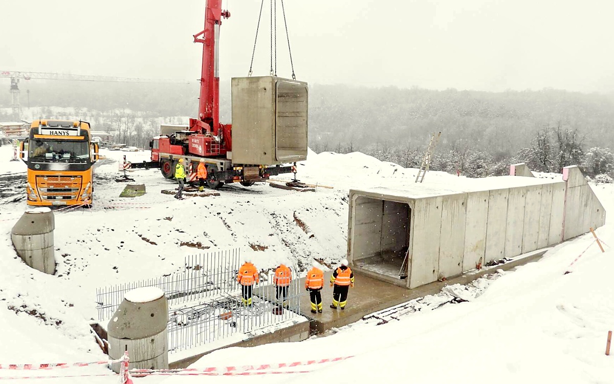 Podchod bude dlouhý několik desítek metrů. Po vyhloubení jámy se nyní montuje dohromady z obřích několikatunových betonových prefabrikovaných dílů. Prvních pár dílů na místo zamířilo již ke konci listopadu a tento týden pracovníci stavebních firem přivezli a upevnili další. Náklaďáky přivezly přibližně deset „prefabrikátů“, na korbu se vešel vždy jen jeden. Jeřáby je potom pomohly vyložit a následně i namontovat na určené místo. Hlavní montáž podchodu probíhala nyní ve čtvrtek (13.2.).