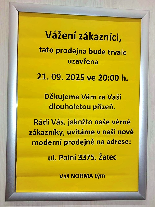 Žatec – Prodejna řetězce Norma na sídlišti Jih 3 v Žatci bude končit. V provozu v tomto místě byla skoro třicet let – od roku 1997. Teď bude pro zákazníky otevřena už jen do 21. září. Ve městě však značka Norma bude působit dál. Její nová prodejna, která byla otevřena loni v listopadu v Polní ulici, na konci Pražské ulice poblíž kasáren a odbočky na Bezděkov, zůstává k dispozici pro všechny zájemce o nákupy.