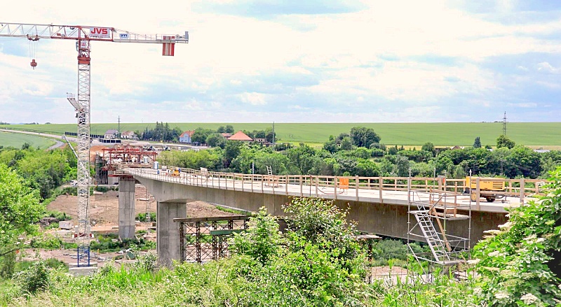 Žiželice, Žatecko – V Žiželicích opět pokročila stavba obchvatu s novým vysokým silničním mostem přes údolí. Most bude dlouhý celkem 380 metrů a aktuálně jsou z něj hotovy již více než tři čtvrtiny rozsahu a délky – zbývá dokončit posledních 80 metrů. Stavební práce v terénu u Žiželic probíhají už tři roky a potrvají ještě přibližně do konce letošního roku. Potom už řidiči budou moci vjet na nově postavený most a obchvat, díky nimž se cesta mezi Žatcem a Mostem zkrátí časově přibližně o pět až deset minut – oproti dřívějším podmínkám „odpadnou“ serpentiny, průjezd obcí, železniční přejezd s občasným čekáním a podobně. Podobné to bylo i v roce 2016, kdy se poprvé otevřel podobný nově postavený viadukt přes údolí v sousední Velemyšlevsi a cesta na hlavním tahu rovněž „zrychlila“.